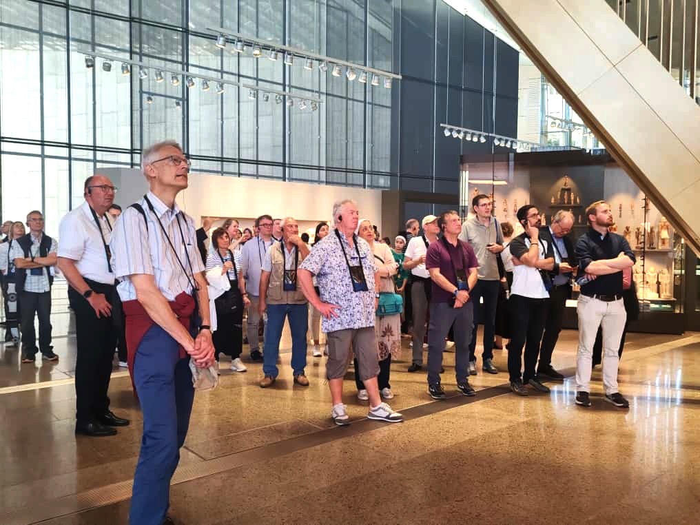 واستعرض المرافقون للوفد الأسلوب العصري في العرض المتحفي باستخدام أحدث تقنيات التوثيق الرقمي، وتسجيل القطع الأثرية وصيانتها وترميمها. كما أُشير إلى أن تصميم واجهة المتحف استلهم شكل الأهرامات عبر تقسيمات هندسية تعتمد على نظرية رياضية للعالم البولندي جورج بول، في إشارة رمزية إلى عبقرية العمارة المصرية القديمة.