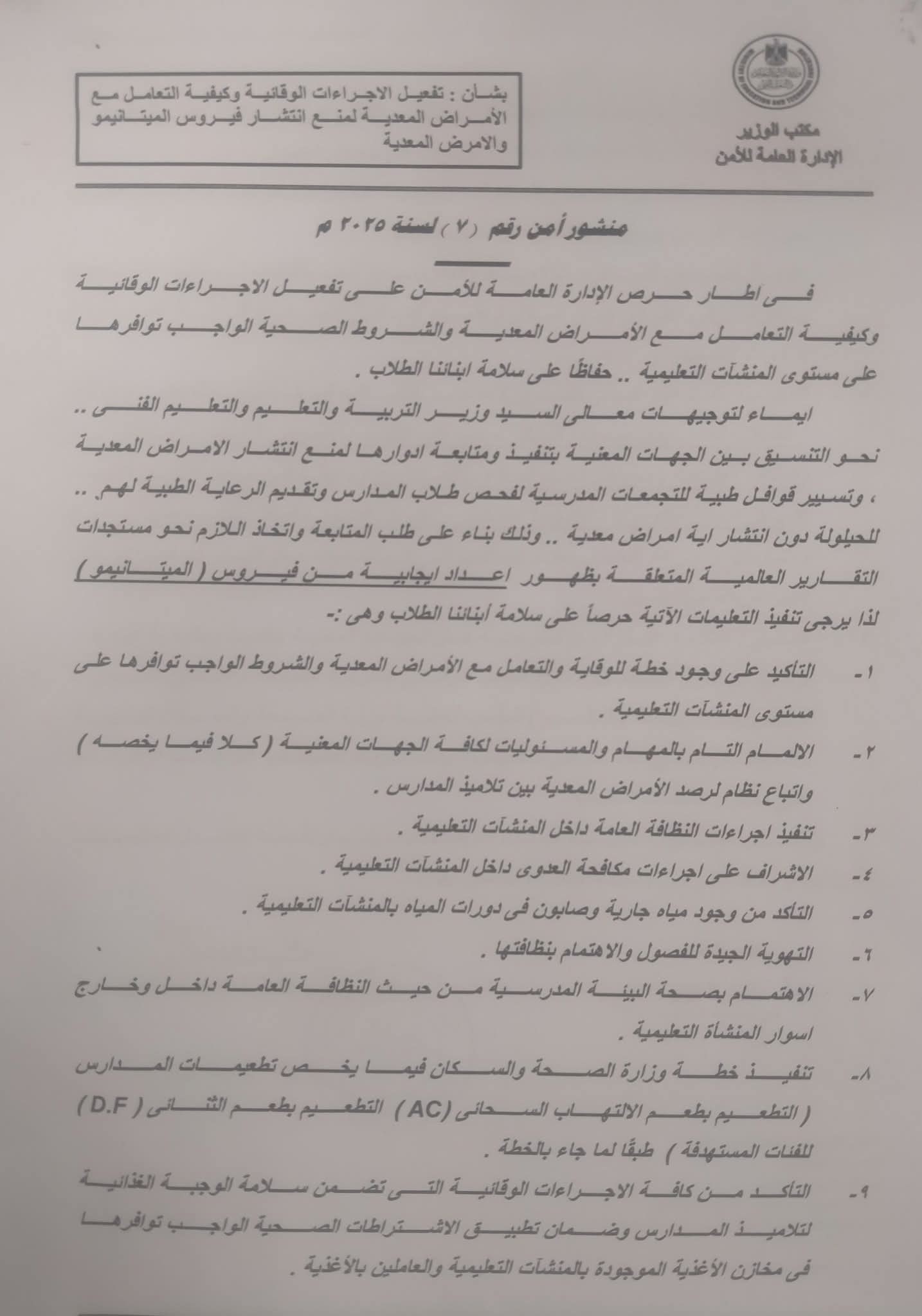 وجهت وزارة التربية والتعليم والتعليم الفني، خطابا رسميا للمديريات التعليمية، بشأن تفعيل الإجراءات الوقائية وكيفية التعامل مع الأمراض المعدية لمنع انتشار فيروس الميتانيمو والأمرض المعدية.