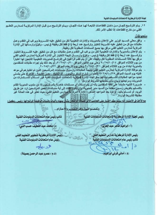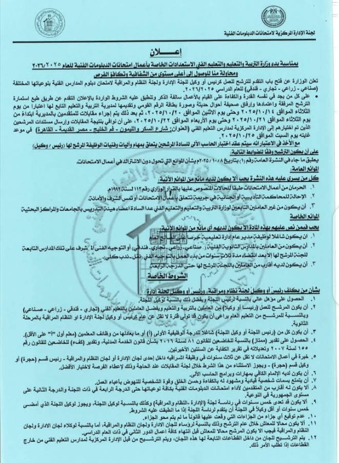 ووافق محمد عبداللطيف وزير التربية والتعليم والتعليم الفني، على الإعلان بالمديريات والإدارات التعليمية لكل من تنطبق عليه الشروط ويرغب في التقدم وعمل مقابلات مع كل من تنطبق عليه الشروط لاختيار وترشيح عدد أربعة (٤) فقط لكل وظيفة رئيس – (وكيل) وارسالها إلى الإدارة المركزية المدارس التعليم الفني مرفق بها جميع المستندات المطلوبة لكل وظيفة.