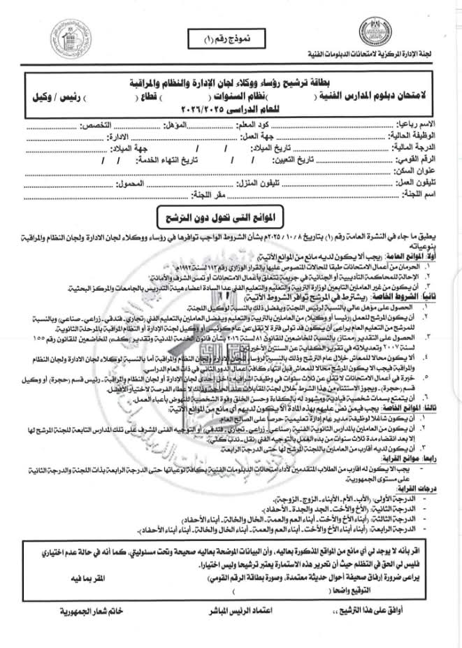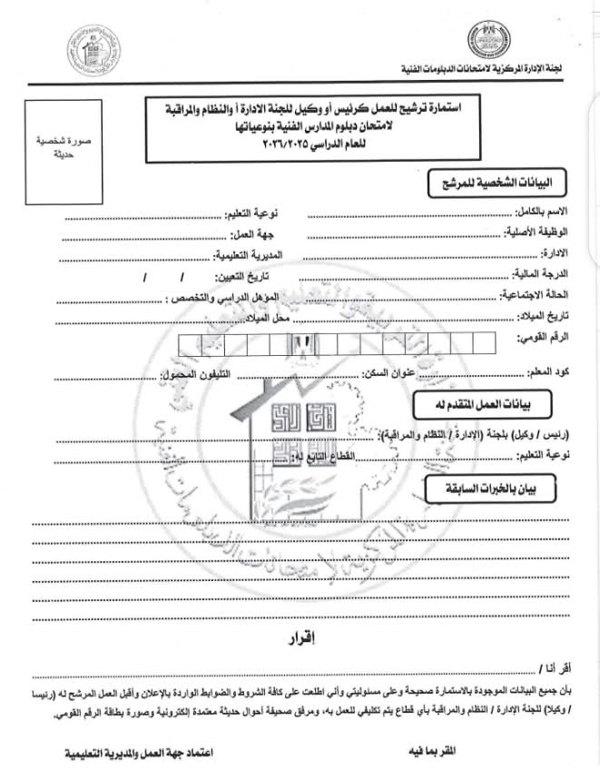 ووجهت كل من يجد في نفسه القدرة والكفاءة على القيام بالأعمال سالفة الذكر وتنطبق عليه الشروط الواردة بالإعلان التقدم عن طريق طبع استمارة الترشح واعتمادها وإرفاق صحيفة أحوال حديثة وصورة بطاقة الرقم القومي وتقديمها لمديرية التربية والتعليم التابع لها اعتبارا من يوم الثلاثاء الموافق ۲۰۲۵/۱۰/۱٤ وحتى يوم الاثنين الموافق ۲۰۲۵/۱۰/۲۰ .