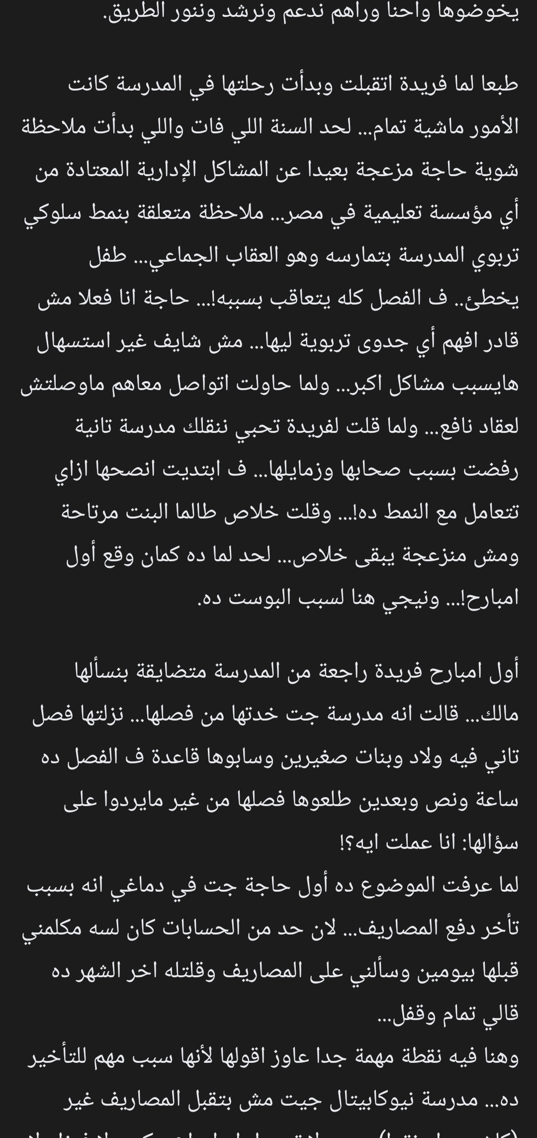وطالب ولي الأمر وزير التربية والتعليم بسرعة فتح تحقيق في الانتهاكات التربوية التي تمارسها إدارة المدرسة، مشيرًا إلى أن الهدف من الشكوى ليس فقط رد الاعتبار لابنته، وإنما حماية باقي الأطفال من التعرض لمعاملة مشابهة داخل المؤسسات التعليمية الخاصة.