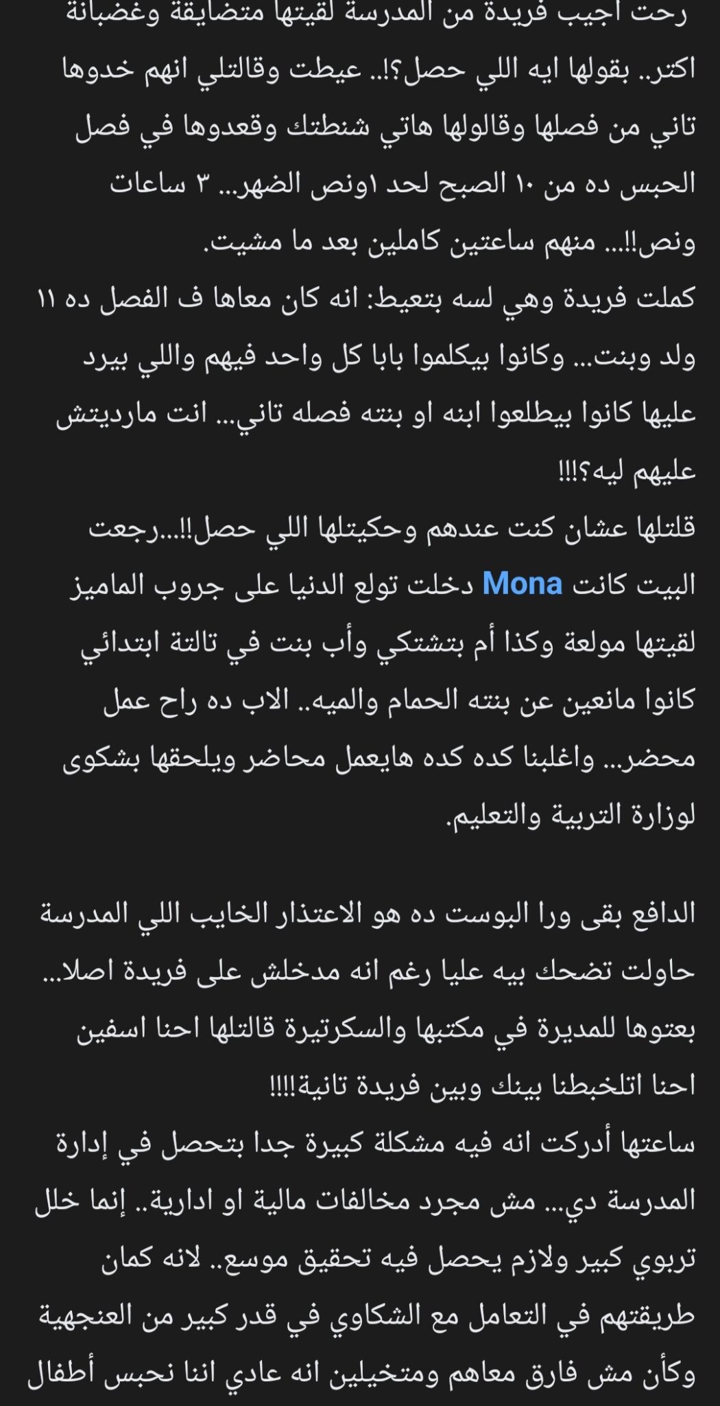 وقال ولي الأمر في منشور عبر صفحته على موقع التواصل الاجتماعي فيس بوك، إن المدرسة الخاصة استدعت نجلته من فصلها لـ فصل آخر مع مجموعة من الطلاب الذين تأخر أولياؤهم عن السداد، دون إبلاغهم بسبب ذلك، فيما تم حرمان الأطفال من الشرب ودخول الحمام، في سلوك وصفه بأنه إهانة نفسية وتربوية لا تمت بصلة لأي معايير تعليمية أو إنسانية.