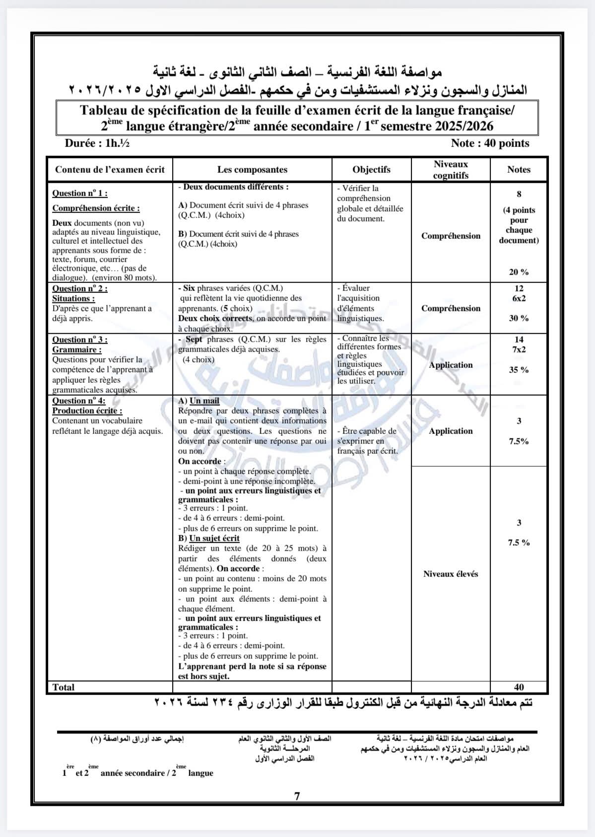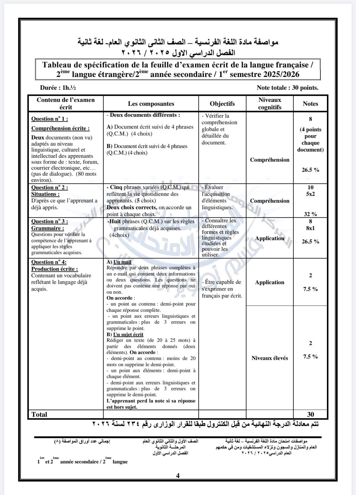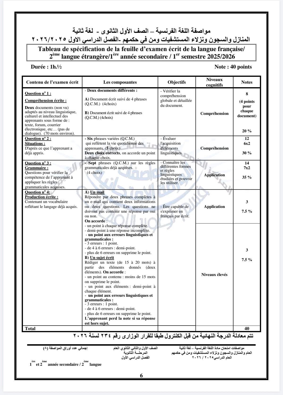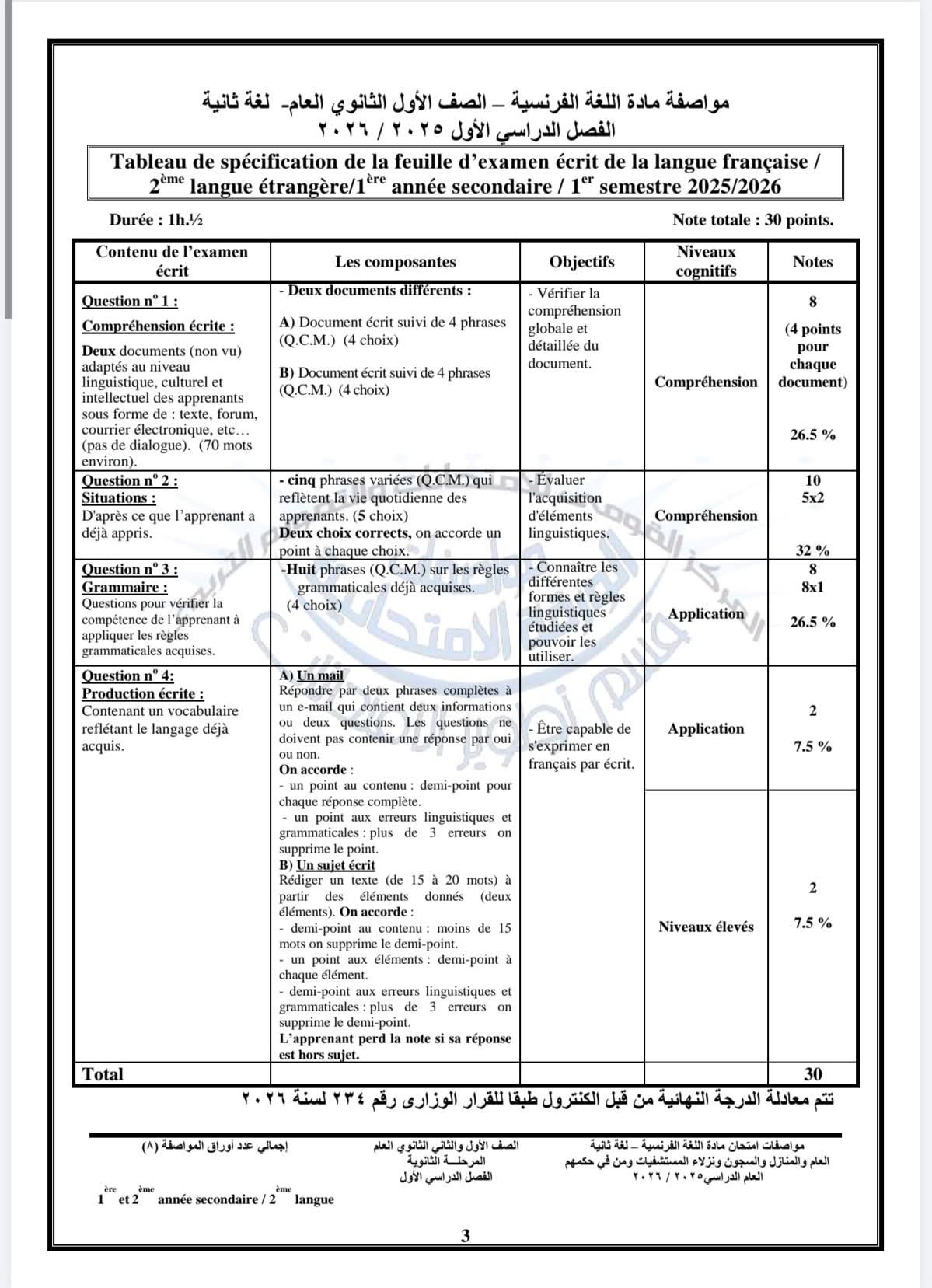 وتضمنت مواصفات امتحان مادة اللغة الفرنسية لطلاب الأول والثاني الثانوي الآتي:
