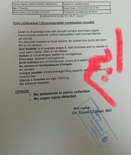 وتابعوا أن المدرسة أرسلت تقريرًا عن حالة الطفلة المصابة يتضمن فحصًا بالموجات الصوتية للبطن والحوض، متسائلين عن علاقة هذا الفحص بالدماغ وغياب تقرير الأشعة CT للدماغ.