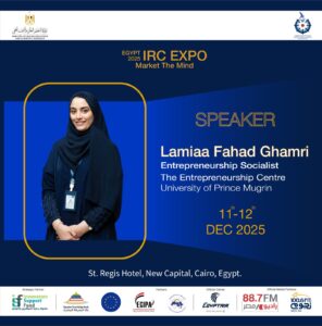 كما تشارك من المملكة العربية السعودية الخبيرة Lamiaa Fahad Ghamri، أخصائية ريادة الأعمال بمركز ريادة الأعمال بجامعة الأمير مقرن، والمعروفة بعملها على دعم الشباب وبناء بيئات ابتكار جامعية مستدامة. وتشارك أيضًا في الجلسة النقاشية الخاصة بثورة “المهمة الثالثة” ودور الجامعات كحاضنات للابتكار.