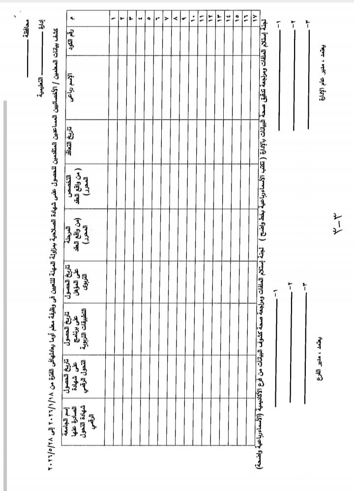 وشددت المهنية للمعلمين، على ضرورة مراعاة أن يكون لكل تخصص كشوف مستقلة )، وتعتبر الإدارة التعليمية مسئولة مسئولية كاملة عن صحة تلك البيانات وتسليم كشوف البيانات مرافقة للملفات إلى فرع الأكاديمية المهنية للمعلمين التابعة له ، وذلك إعتبارا من يوم ۲۰۲۹/۱/۱۸ وحتى يوم ٢٠٢٦/٥/٢٨م .