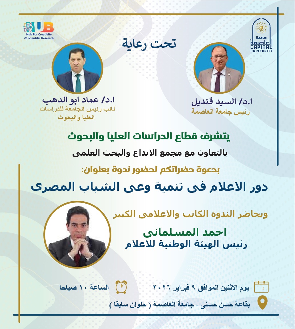 ينظم قطاع الدراسات العليا والبحوث جامعة العاصمة بالتعاون مع مجمع الإبداع والبحث العلمي ، ندوة علمية بعنوان: “دور الإعلام في تنمية وعي الشباب المصري”