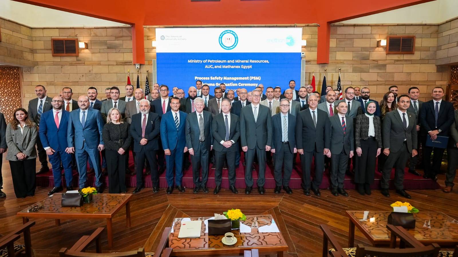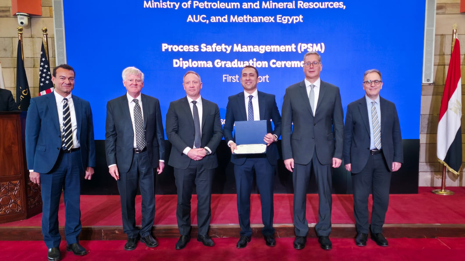 احتفلت الجامعة الأمريكية بالقاهرة اليوم بتخريج 32 خبيراً متخصصًا في قطاع البترول يشكلون الدفعة الأولى من الدبلومة المهنية في إدارة سلامة العمليات، وذلك من خلال تعاون ثلاثي بين الجامعة ووزارة البترول والثروة المعدنية وشركة ميثانكس مصر. حضر حفل التخرج المهندس كريم بدوي، وزير البترول والثروة المعدنية، والدكتور أحمد دلاّل، رئيس الجامعة الأمريكية بالقاهرة، وريتش سومنر، الرئيس التنفيذي العالمي لشركة ميثانكس، ومحمد شندي، العضو المنتدب لشركة ميثانكس، والدكتور لطفي جعفر، عميد كلية العلوم والهندسة بالجامعة، والمهندس ياسين محمد، وكيل أول وزارة البترول والثروة المعدنية، والمهندس علاء الدين عبد الفتاح، رئيس مجلس إدارة الشركة المصرية القابضة للبتروكيماويات ولفيف من قيادات قطاع البترول والغاز والجامعة.