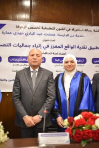 وقد شهدت المناقشة تفاعلاً مثمراً بين الباحثة وأعضاء لجنة الحكم والمناقشة، الذين أشادوا بجهودها في توظيف تقنيات الواقع المعزز لتعزيز جماليات التصميم البيئي، بما يفتح آفاقاً جديدة أمام الباحثين والمصممين في مجالات العمارة والفنون التطبيقية.