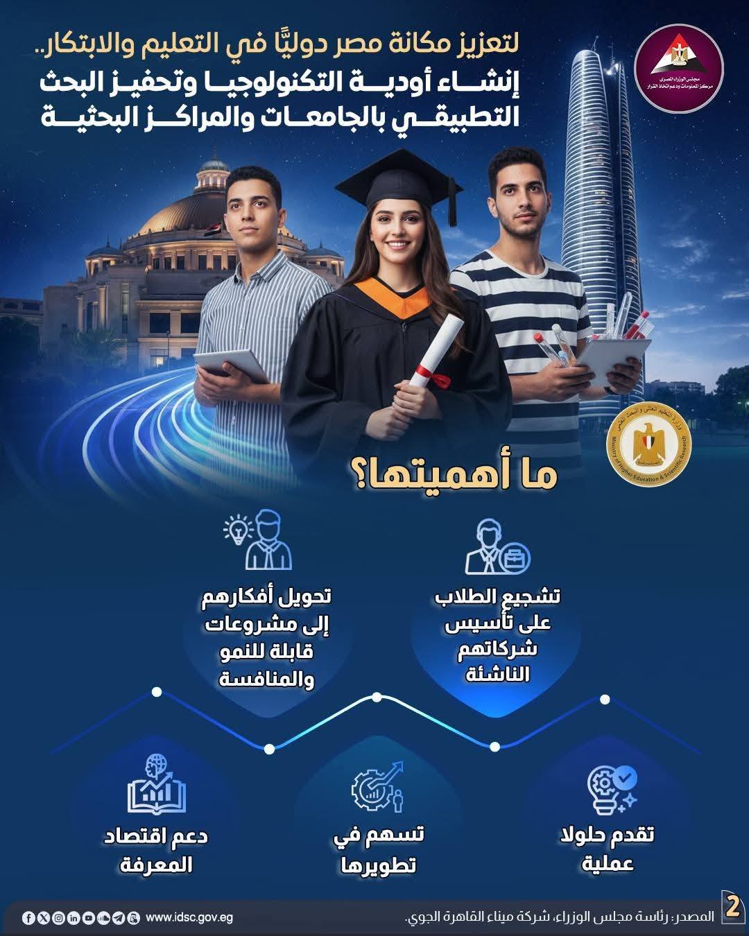 وأوضح الوزير أن هذا التوجه يأتي بهدف تعزيز منظومة الابتكار، وترسيخ ثقافة ريادة الأعمال داخل المؤسسات التعليمية والبحثية، بما يخلق بيئة محفزة قادرة على مواكبة متطلبات السوقين المحلي والدولي، والاستجابة للتحديات التنموية المتسارعة.