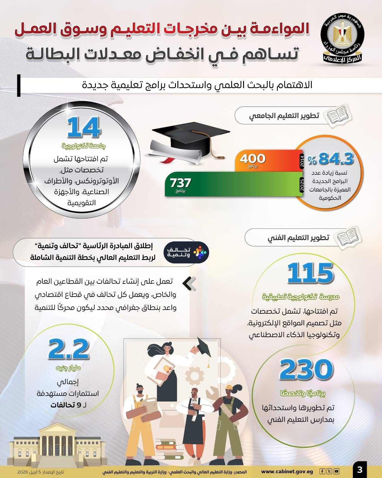 ويأتي ذلك في إطار توجه الدولة نحو تطوير منظومة التعليم والارتقاء بجودتها بما يعزز ارتباطها باحتياجات سوق العمل، حيث أظهرت المؤشرات الدولية تحسنًا ملحوظًا في مستوى المواءمة بين التخصصات التعليمية ومتطلبات التشغيل، وقد أسهم هذا التوجه في دعم فرص التوظيف وتراجع معدلات البطالة، لا سيما بين حملة المؤهلات المتوسطة والعليا، بالتوازي مع التوسع في استحداث برامج تعليمية حديثة، وتعزيز البحث العلمي، وتطوير مسارات تعليمية تواكب التحولات التكنولوجية والاقتصادية.